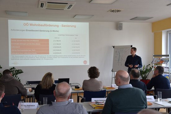Das Trainingsseminar mit 21 TeilnehmerInnen widmete sich bau- und energietechnischen Fragen, die diese Formen der Wohnraumerweiterung mit sich bringen. Dazu zählen u. a. bauphysikalische Themen bei Anschlüssen, Fenstertausch, Innendämmung, Vollwärmeschutz und Flachdächern. Im Mittelpunkt standen Förderkriterien.