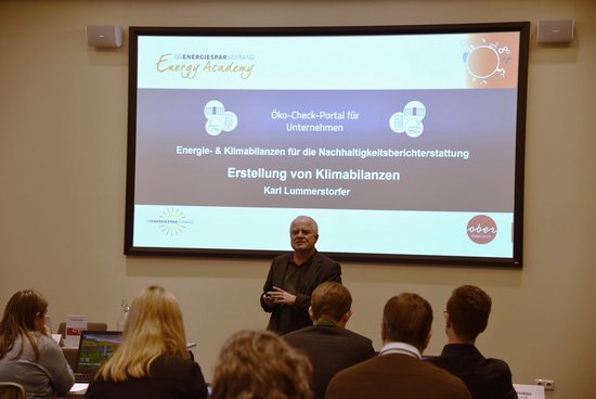Das Trainingsseminar mit 29 TeilnehmerInnen informierte über die Erstellung von Energie- und Klimabilanzen und die Möglichkeiten, daraus Maßnahmen zur CO2-Reduktion abzuleiten, um im Unternehmen auf dem Weg zur Klimaneutralität voranzukommen. Die TeilnehmerInnen erwarben das Know-how zur Erstellung einer Energie- und Klimabilanz für das eigene Unternehmen und erarbeiteten mit Hilfe eines neuen Online-Tools eine individuelle Test-Bilanz. Diese umfasste Scope 1 (direkte Emissionen), Scope 2 (indirekte Emissionen aus eingekaufter Energie) und Scope 3 (indirekte Emissionen entlang der Wertschöpfungskette des Unternehmens).